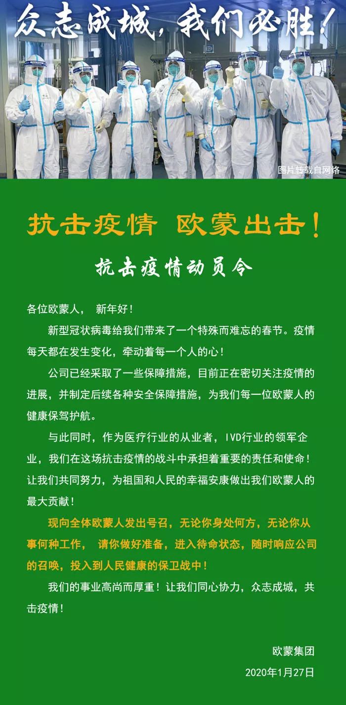 2020年的春節(jié),因?yàn)橐粓鲂滦凸跔畈《痉窝椎膫鞑ィ尯芏嗳说拇汗?jié)假期因此改變。自疫情發(fā)生以來,歐蒙一直都保持著高度的關(guān)注,面對(duì)疫情快速響應(yīng),在第一時(shí)間成立了三個(gè)工作組,部署相 關(guān)戰(zhàn)略實(shí)施:應(yīng)急領(lǐng)導(dǎo)小組、銷服協(xié)調(diào)小組、緊急行動(dòng)小組。應(yīng)急領(lǐng)導(dǎo)工作小組第一時(shí)間將公司最新動(dòng)態(tài)與決策以最快速度傳遞到每一位歐蒙員工中,并采取各種措施保障員工的安全;銷服協(xié)調(diào)小組緊急召回部分員工,保證我們對(duì)醫(yī)療機(jī)構(gòu)的支持與服務(wù);緊急行動(dòng)小組通過對(duì)新冠病毒檢測服務(wù)與產(chǎn)品的開發(fā),力爭為抗擊疫情做出更多貢獻(xiàn)。大家眾志成城、共克時(shí)艱!