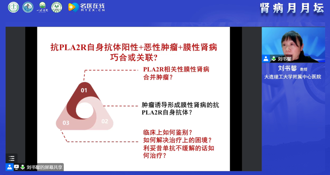 劉書馨教授分享了合并肺癌的膜性腎病病例,通過病例的分析和長(zhǎng)期隨訪治療,詳細(xì)闡述了該患者的具體病情。劉教授也提出了疑問抗PLA2R自身抗體陽(yáng)性、惡性腫瘤及膜性腎病是否是巧合還是存在關(guān)聯(lián)?惡性腫瘤相關(guān)膜性腎病的腎組織和血液循環(huán)中較少檢出PLA2R抗體,但抗PLA2R抗體陽(yáng)性不能排除腫瘤繼發(fā)的膜性腎病。腫瘤可能會(huì)繼發(fā)患者的自身免疫反應(yīng),PLA2R被證明調(diào)節(jié)多種抗腫瘤和抗炎反應(yīng),包括細(xì)胞凋亡、復(fù)制活應(yīng)激誘導(dǎo)的衰老,并且抑制細(xì)胞的轉(zhuǎn)化。關(guān)于腫瘤和膜性腎病之間是因果關(guān)系還是并發(fā)關(guān)系,劉教授也指出了有研究提出的三個(gè)確定標(biāo)準(zhǔn):一個(gè)是惡性腫瘤經(jīng)治療后膜性腎病是否緩解;其次腎病復(fù)發(fā)與惡性腫瘤復(fù)發(fā)是否同步;第三在免疫沉積物中檢測(cè)腫瘤抗原或抗腫瘤抗體。但是臨床實(shí)踐中很難應(yīng)用這種標(biāo)準(zhǔn),盡管這些標(biāo)準(zhǔn)為因果關(guān)系提供了有力證據(jù),但缺少這些結(jié)果也并不能完全否認(rèn)腫瘤的存在。劉教授最后指出,膜性腎病與腫瘤之間的關(guān)系還需要進(jìn)一步的研究,因此未來(lái)需要大量的臨床病例以及更多的研究來(lái)尋找特異性抗原在血清學(xué)、腎組織中的表達(dá)、臨床意義,以及與惡性腫瘤之間的任何潛在聯(lián)系來(lái)輔助臨床決策,避免漏診誤診而導(dǎo)致的膜性腎病不緩解或腫瘤惡化。這對(duì)于腫瘤相關(guān)性膜性腎病患者的診斷和治療具有重要意義。