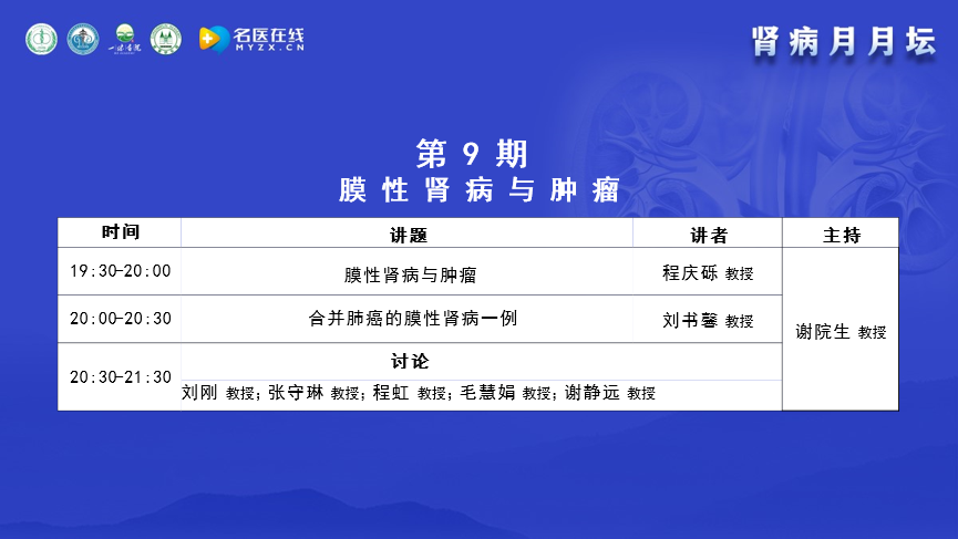眾所周知,腎臟病患病率很高,特別是膜性腎病,在很多單位的腎活檢比率中占據(jù)第一;膜性腎病的無(wú)創(chuàng)診斷和治療手段日新月異;而且膜性腎病的異質(zhì)性很大,很多膜性腎病的病理表現(xiàn)大同小異,但是致病原因卻不一致,診療手段應(yīng)對(duì)應(yīng)病因?;诖吮尘?,“腎病月月壇”自2022年5月17日開始舉辦,在每個(gè)月的第三周的周二晚上,每月一期,每期一個(gè)主題,已經(jīng)舉辦了八期,包括“激素和免疫抑制劑在膜性腎病的合理應(yīng)用”、“利妥昔單抗在膜性腎病的合理應(yīng)用”、“原發(fā)性和繼發(fā)性膜性腎病的鑒別”、“中醫(yī)對(duì)膜性腎病的認(rèn)識(shí)”、“膜性腎病的抗原分類及發(fā)病機(jī)制”、“膜性腎病的臨床表現(xiàn)、無(wú)創(chuàng)診斷和病理診斷”、“膜性腎病的自發(fā)緩解和非免疫抑制治療”、“非典型膜性腎病的病理表現(xiàn)及鑒別診斷思路”。本期是該論壇的第9期,主題是“膜性腎病與腫瘤”,膜性腎病很容易合并惡性腫瘤,腫瘤可以發(fā)生在膜性腎病之前、也可以發(fā)生在膜性腎病之后,兩者可以是因果關(guān)系、也可以是伴隨關(guān)系,膜性腎病合并惡性腫瘤治療很麻煩,針對(duì)這些問題,本期特舉辦膜性腎病與腫瘤的專題學(xué)術(shù)活動(dòng),邀請(qǐng)的講者和點(diǎn)評(píng)、討論嘉賓都是業(yè)內(nèi)非常著名的臨床專家、研究生導(dǎo)師、腎內(nèi)科主任,具有豐富的臨床、教學(xué)和科研經(jīng)驗(yàn),相信他們的分享一定會(huì)對(duì)大家的臨床診療有所幫助。