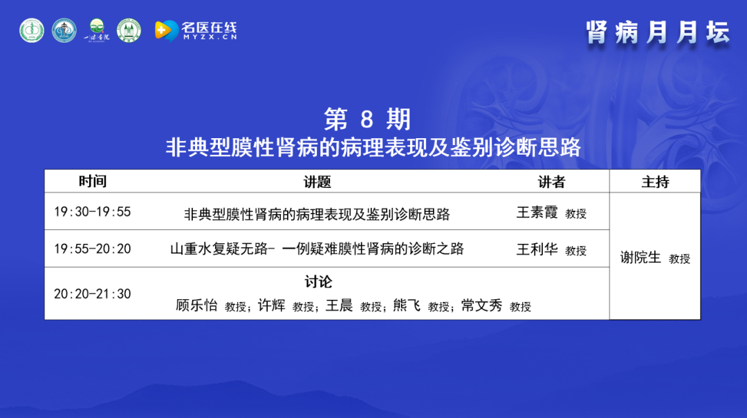 眾所周知,腎臟病患病率很高,特別是膜性腎病,在很多單位的腎活檢比率中占據(jù)第一;膜性腎病的無創(chuàng)診斷和治療手段日新月異;而且膜性腎病的異質(zhì)性很大,很多膜性腎病的病理表現(xiàn)幾乎一致,但是致病原因卻不一致,診療手段應(yīng)對應(yīng)病因。基于此背景,“腎病月月壇”自今年5月17日以來開始舉辦,在每個月的第三周的周二晚上,每月一期,每期一個主題,已經(jīng)舉辦了七期,包括“激素和免疫抑制劑在膜性腎病的合理應(yīng)用”、“利妥昔單抗在膜性腎病的合理應(yīng)用”、“原發(fā)性和繼發(fā)性膜性腎病的鑒別”及“中醫(yī)對膜性腎病的認(rèn)識”、“膜性腎病的抗原分類及發(fā)病機(jī)制”、“膜性腎病的臨床表現(xiàn)、無創(chuàng)診斷和病理診斷”以及“膜性腎病的自發(fā)緩解和非免疫抑制治療”。今天是第8期,本期論壇的主題是“非典型膜性腎病的病理表現(xiàn)及鑒別診斷思路”。邀請的講者和點(diǎn)評、討論嘉賓都是業(yè)內(nèi)非常著名的臨床專家、研究生導(dǎo)師、腎內(nèi)科主任,具有豐富的臨床、教學(xué)和科研經(jīng)驗(yàn),相信他們的分享一定會對大家的臨床診療有所幫助。