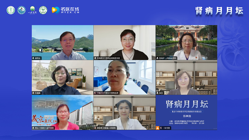 2024年6月18日,由北京中西醫結合學會腎臟病專業委員會舉辦的《腎病月月壇(第26期)——多發性骨髓瘤及其腎損害的診斷與治療》于線上成功舉行。本次論壇由北京中西醫結合學會腎臟病專業委員會主任委員、北京中西醫結合腎臟疑難病會診中心主任、北京大學航天中心醫院主任醫師特聘教授、解放軍總醫院及南開大學醫學院博士生導師謝院生教授擔任大會主席,解放軍總醫院第五醫學中心朱海燕教授、上海交通大學醫學院附屬瑞金醫院陳曉農教授作為講課嘉賓,首都醫科大學附屬北京朝陽醫院孫倩美教授、北京中醫藥大學東方醫院丁曉慶教授、解放軍總醫院第一醫學中心吳杰教授、中國醫科大學附屬盛京醫院周華教授以及河南省人民醫院曹慧霞教授作為本次大會的討論嘉賓。