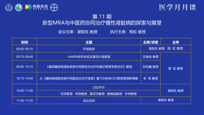 謝教授表示“醫(yī)學(xué)月月談”的前身是“腎病月月壇”,升級為醫(yī)學(xué)月月談不僅是名稱的拓展,更是學(xué)術(shù)視野的延伸。會議議題已從單一腎病領(lǐng)域,拓展至腎內(nèi)科、風(fēng)濕免疫科、神經(jīng)內(nèi)科、檢驗科等多學(xué)科交叉融合的平臺。此外,我們始終以 “臨床需求為導(dǎo)向、解決臨床問題為目的”。堅持每月1~ 2 次、線上線下聯(lián)動,每期聚焦一個主題,通過“講座+點評討論”的形式,推動西醫(yī)與中醫(yī)、臨床與檢驗病理、精準(zhǔn)診斷與有效治療的深度結(jié)合。本期醫(yī)學(xué)月月談的主題是新型MRA與中醫(yī)藥協(xié)同治療慢性腎臟病的探索與展望,非常榮幸能夠邀請到首都醫(yī)科大學(xué)附屬北京安貞醫(yī)院程虹教授擔(dān)任執(zhí)行主席,相信在程教授的帶領(lǐng)下,各位同道能夠積極交流、碰撞思想,共同為解決慢性腎臟病臨床難題貢獻力量!