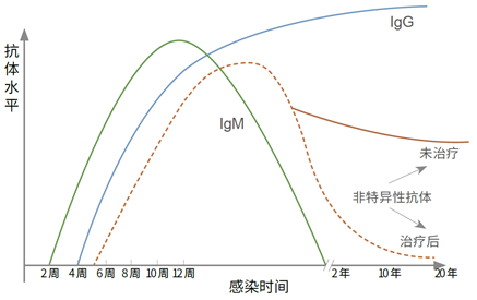 梅毒感染的診斷需綜合流行病學(xué)史、臨床表現(xiàn)和實驗室檢查等。梅毒IgM最早出現(xiàn),抗體水平與疾病活動度及治療效果相關(guān)。梅毒IgG 4周左右出現(xiàn),不易消退,可持續(xù)終生。