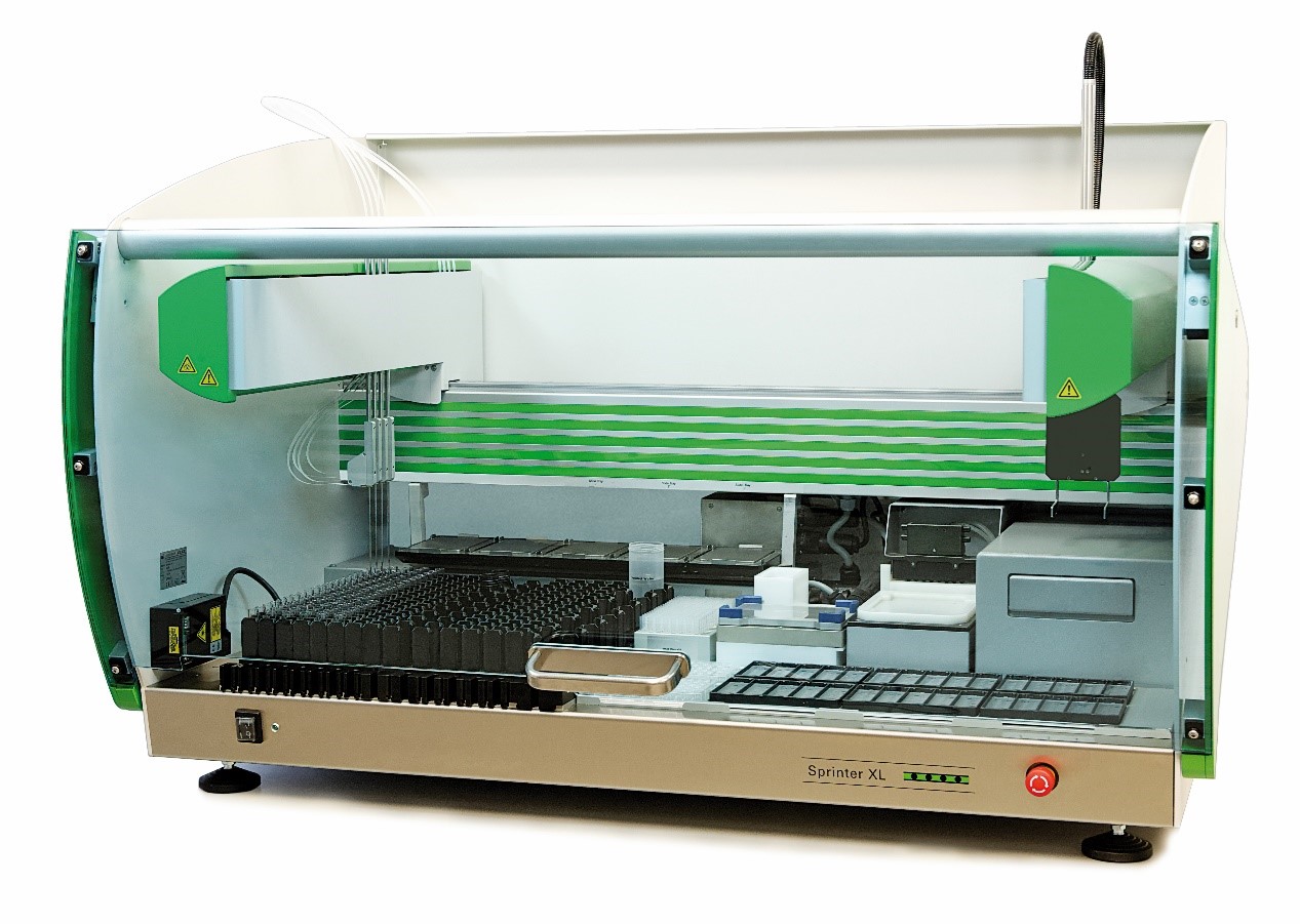 Sprinter XL提供靈活的解決方案,用于全自動處理中等和高等樣本量的間接免疫熒光檢測。設(shè)備執(zhí)行樣本的識別、稀釋和轉(zhuǎn)移,以及所有洗滌和孵育步驟。Sprinter XL作為一臺組合設(shè)備,也可以同時處理ELISA測試,是一套全自動處理間接免疫熒光和ELISA檢測的靈活系統(tǒng)。針對不同實驗室的要求提供可選擇的儀器配置,一次運行可處理240個樣本和30張熒光載片或6個ELISA微孔板。
